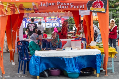 | Penampilan band lokal, berlatar spanduk bazar makanan murah serba 5 ribu |