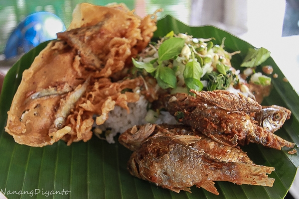 Pecel pincuk iwak kali juga menjadi andalan Ponorogo, menu yang mengenyangkan komplit dengan sayuran sambal, dan iwak kali goreng ini juga membuat penasaran para pengunjung hotel, berkali-kali pegawai stand hilir mudik pulang untuk mengambil bahan yang habis, karena untuk menggoreng ikan harus dirumah untuk menghemat tempat di stand yang terbatas ini. Pecel merupakan makanan khas Ponorogo yang bisa dijumpai atau didapakan hampir 24 jam nonstop di berbagai sudut kota.